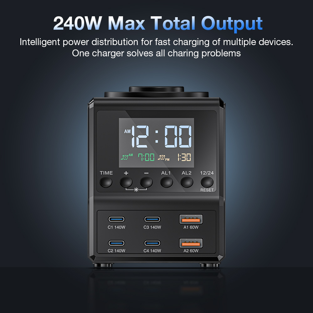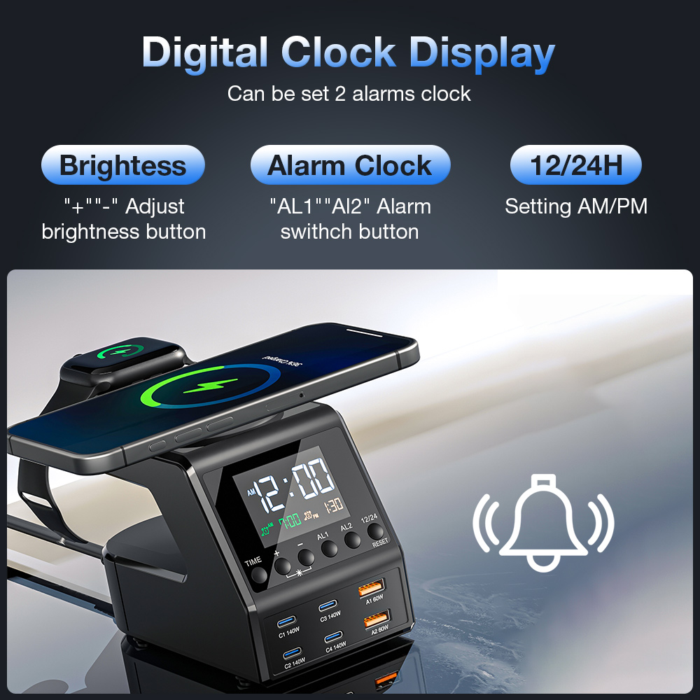 - Wygoda i prostota: Wielofunkcyjna konstrukcja eliminuje potrzebę posiadania więcej niż jednego urządzenia, takiego jak budzik, oddzielna szybka ładowarka i bezprzewodowa ładowarka. Wszystko w jednym, łatwym w użyciu urządzeniu.