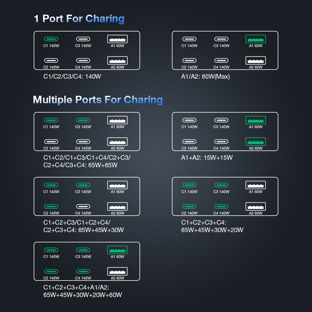 6 dedykowanych portów ładowania (3 x USB-A i 3 x USB Type-C) gwarantuje, że znajdziesz odpowiednie złącze dla wszystkich swoich urządzeń. Porty Type-C obsługują technologię Power Delivery (PD), a porty USB-A standard Quick Charge (QC), optymalizując w ten sposób prędkość ładowania dla danego urządzenia.