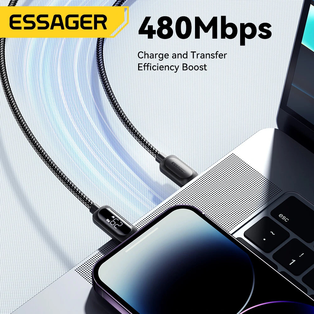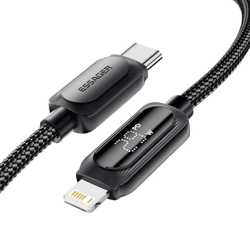 ESSAGER ES-X57 – 1 metr, Type-C – Lightning, kabel USB. Wyświetlacz cyfrowy, ładowanie 29 W, etui z perłowej tkaniny.