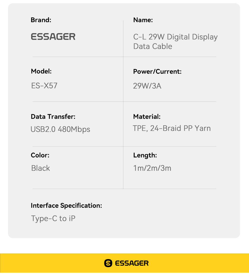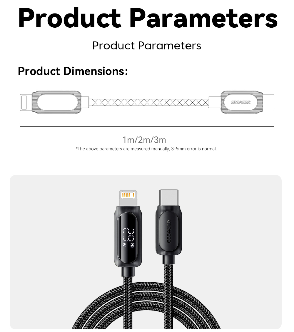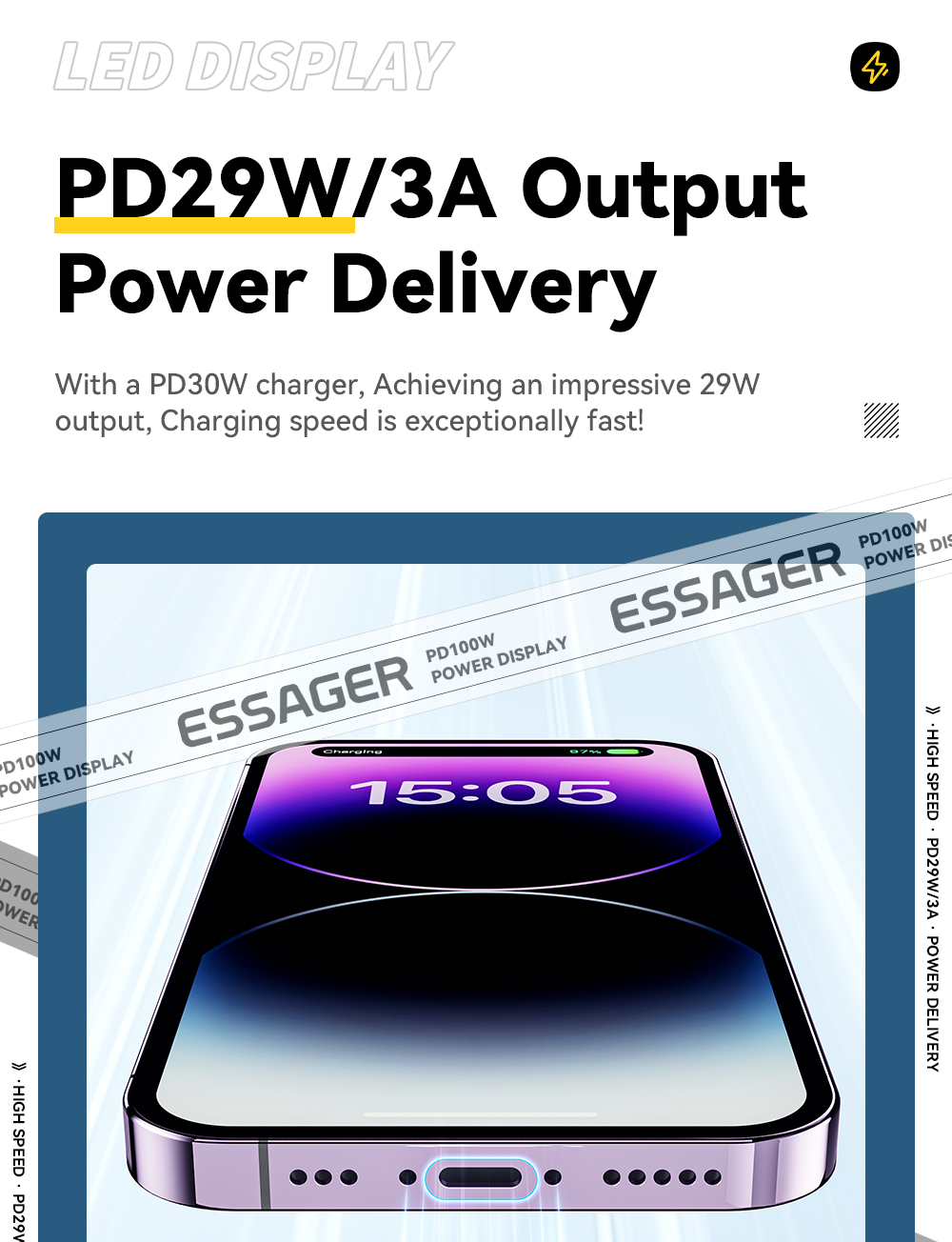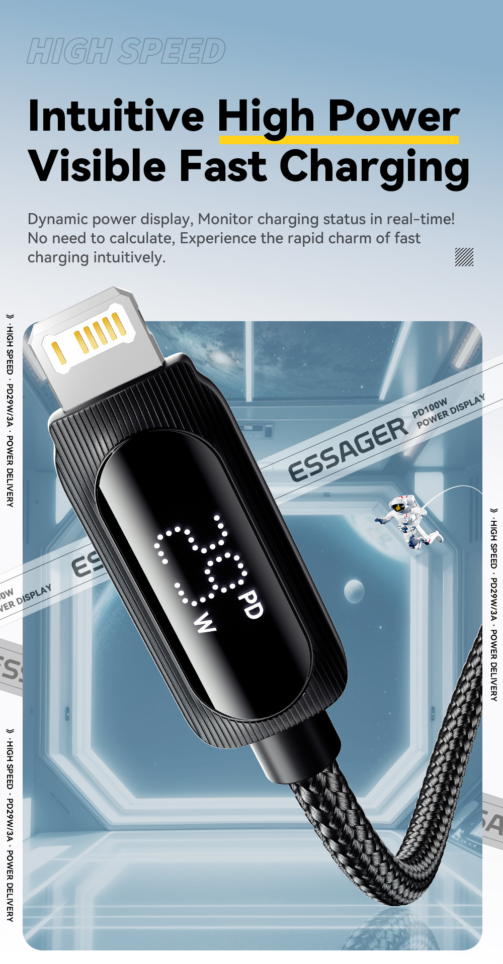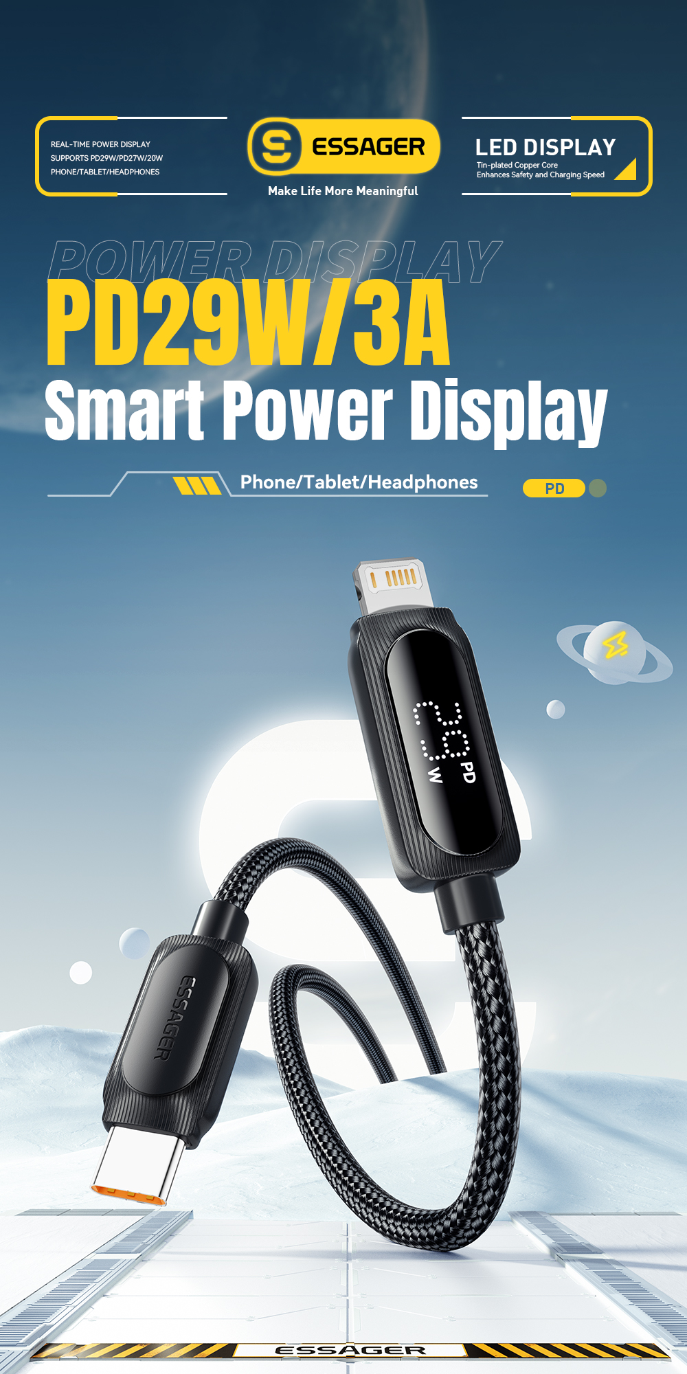 ESSAGER ES-X57 – 3 metr, Type-C – Lightning, kabel USB. Wyświetlacz cyfrowy, ładowanie 29 W, etui z perłowej tkaniny.