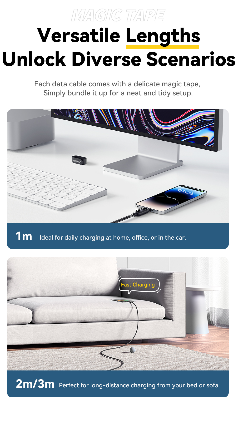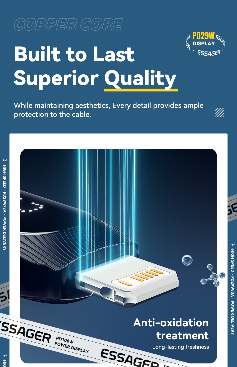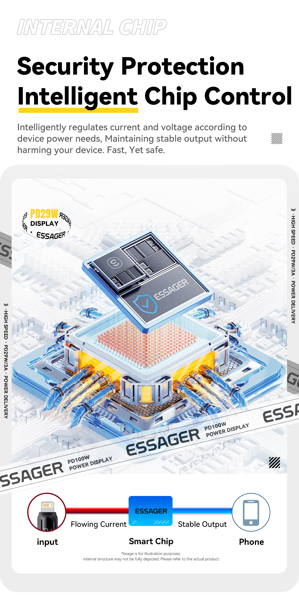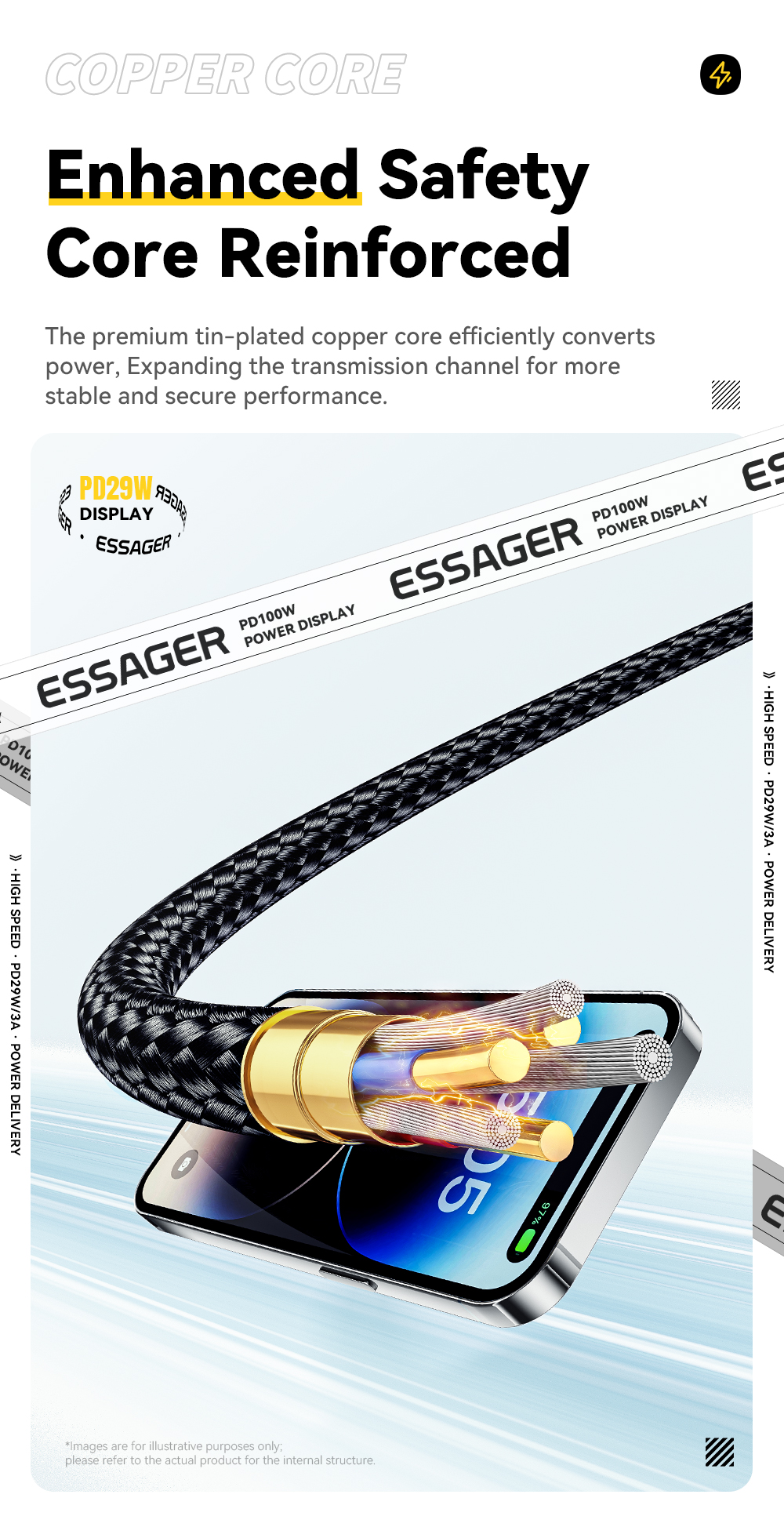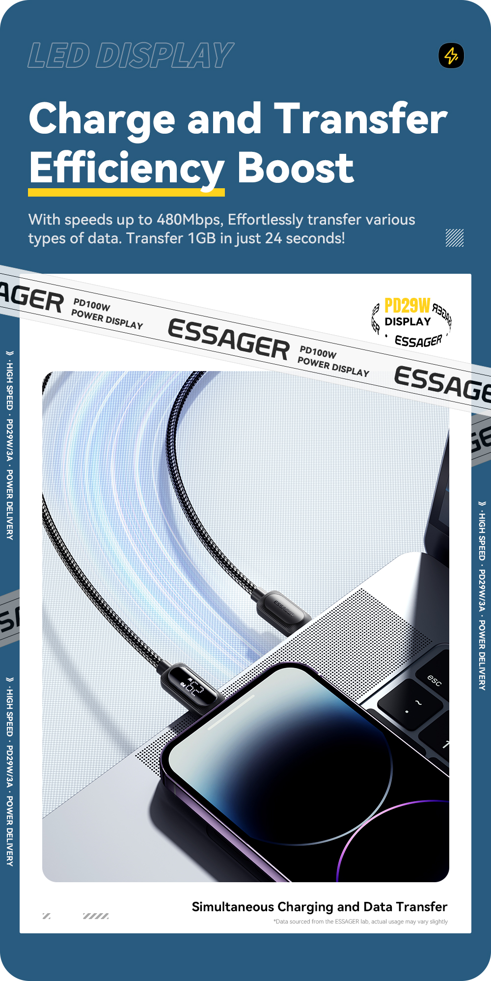 ESSAGER ES-X57 – 3 metr, Type-C – Lightning, kabel USB. Wyświetlacz cyfrowy, ładowanie 29 W, etui z perłowej tkaniny.